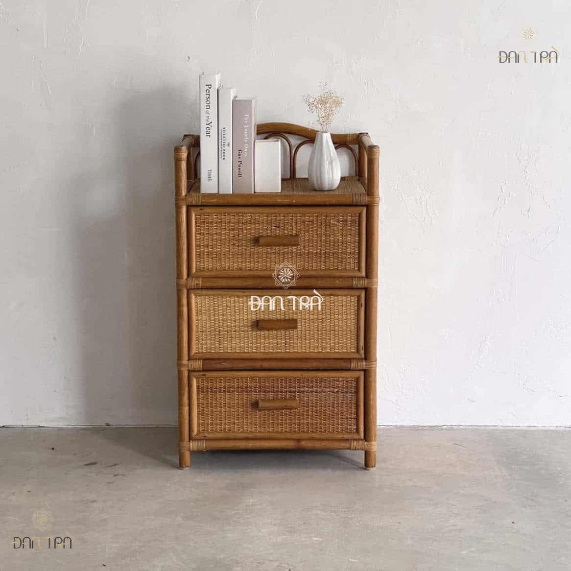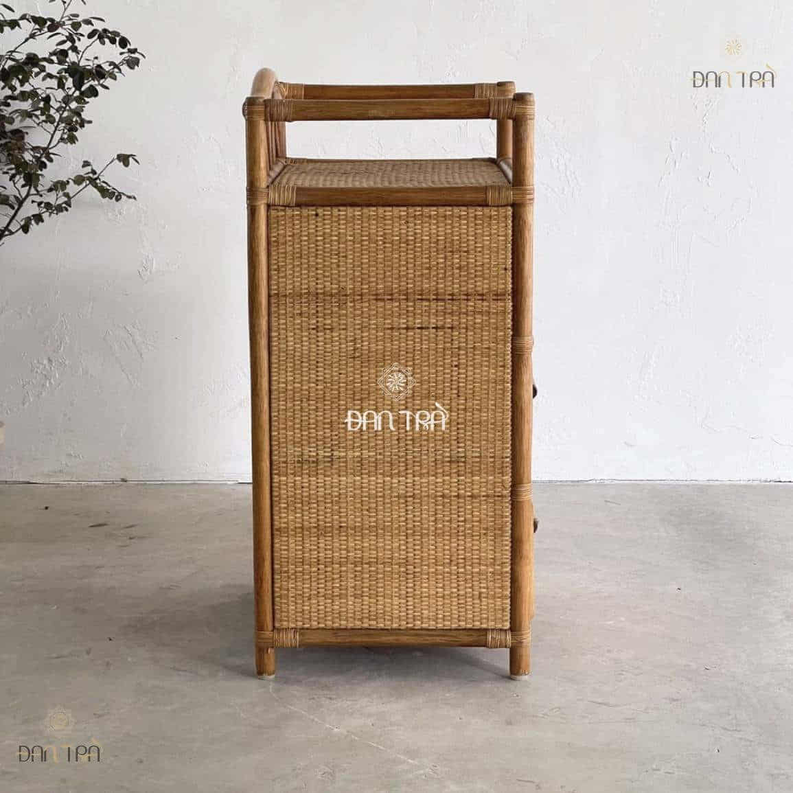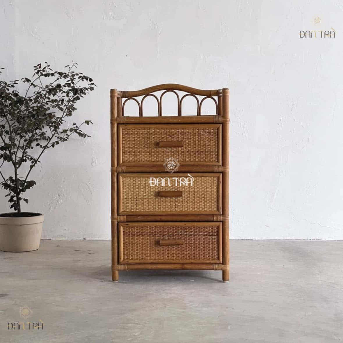 Chiếc tủ mây tre đan đứng hình chữ nhật, chia thành ba ngăn kéo lớn bên dưới và một mặt kệ phía trên, đủ đầy nhưng không cồng kềnh. Phần khung được làm từ các thanh mây tròn chắc chắn, đan nối tạo nên kết cấu vững chãi. Mặt trước của các ngăn kéo được đan kín bằng sợi mây, vừa giữ được nét mộc mạc, vừa mang lại tính thẩm mỹ cao. Điểm nhấn đặc biệt là chi tiết khung vòm hoặc bán nguyệt phía trên cùng tạo sự trang trí nhẹ nhàng mà đầy duyên dáng.